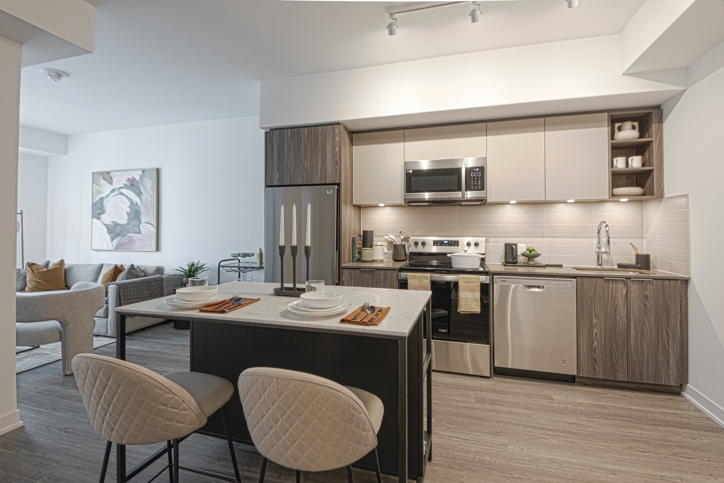 From luxury vinyl flooring to the stacked laundry machines, each suite exudes quality with carefully-chosen elements visible throughout.
